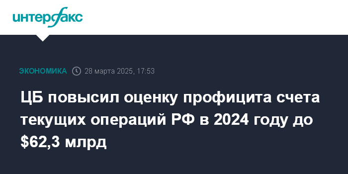Москва. 28 марта. INTERFAX.RU - Профицит счета текущих операций платежного баланса РФ в 2024 году составил $62,3 млрд, что на $12,8 млрд, или на 26,0% больше, чем в 2023 году ($49,4 млрд), следует из обновленной оценки платежного баланса РФ, опубликованной на сайте Банка России.