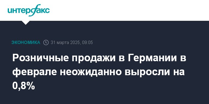 Москва. 31 марта. INTERFAX.RU - Розничные продажи в Германии в феврале увеличились на 0,8% относительно предыдущего месяца, сообщило Федеральное статистическое агентство страны (Destatis).