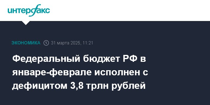 Москва. 31 марта. INTERFAX.RU - Федеральный бюджет РФ в январе-феврале 2025 года исполнен с дефицитом 3,841 трлн рублей, сообщается в информации на сайте Федерального казначейства.