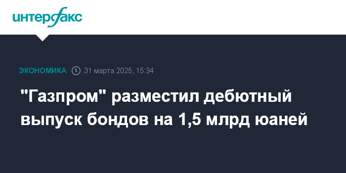 "Газпром" разместил дебютный выпуск бондов на 1,5 млрд юаней