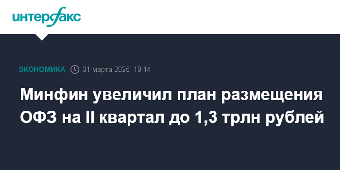 План второго квартала превышает план первых трех месяцев 2025 года, когда Минфин хотел привлечь 1 трлн рублей. В итоге в первом квартале Минфин разместил ОФЗ на общую сумму 1,389 трлн рублей по номиналу (без учета дополнительных размещений после аукционов 26 марта). Объем выручки (объем средств, вырученных от продажи ОФЗ по рыночной стоимости) составил 1,089 трлн рублей.