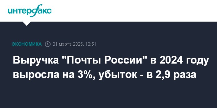 Москва. 31 марта. INTERFAX.RU - Выручка АО "Почта России" в 2024 году по РСБУ составила 219 млрд рублей, увеличившись на 3,3% по сравнению с 2023 годом, говорится в отчетности компании.