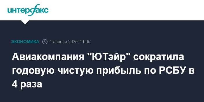 Москва. 1 апреля. INTERFAX.RU - ПАО "Авиакомпания "ЮТэйр" в 2024 году получило 866,7 млн рублей чистой прибыли по РСБУ, что в четыре раза меньше, чем в 2023 году, говорится в отчетности компании.