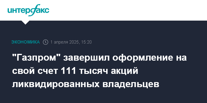 Москва. 1 апреля. INTERFAX.RU - ПАО "Газпром" завершил оформление на свой казначейский счет 111 тысяч акций ликвидированных владельцев по итогам прошедших в 2024 и 2025 судебных процессов.