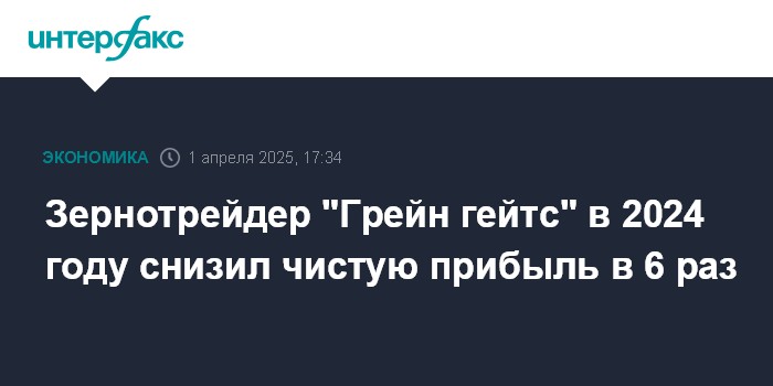 Москва. 1 апреля. INTERFAX.RU - Компания "Грейн гейтс", вышедшая на российский рынок зерна в конце июня 2022 года и ставшая ведущим экспортером, в 2024 году снизила чистую прибыль в 6 раз.