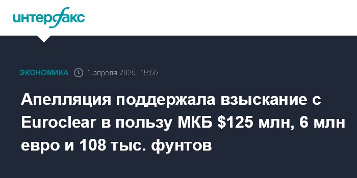 Апелляция поддержала взыскание с Euroclear в пользу МКБ $125 млн, 6 млн евро и 108 тыс. фунтов