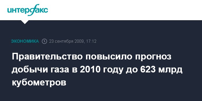 Москва. 23 сентября. INTERFAX.RU - Правительство РФ повысило прогноз по добыче газа в 2010 г. с 596 млрд кубометров до 623 млрд кубометров газа, говорится в уточненном прогнозе социально-экономического развития РФ, одобренном на заседании правительства в среду. Добыча газа в 2011 г. составит 634 млрд кубометров, в 2012 г. - 649 млрд кубометров.