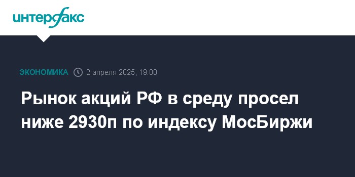 Москва. 2 апреля. INTERFAX.RU - Рынок акций РФ в среду продолжил снижение под давлением продаж на фоне затянувшегося процесса мирного урегулирования военного конфликта вокруг Украины, рисков введения Западом новых антироссийских санкций, а также новостей Минфина РФ об отсутствии возможности новых льгот для нефтяников из-за роста акцизов на топливо; внешние рынки также просели в ожидании объявления президентом США Дональдом Трампом новых пошлин. Индекс МосБиржи откатился ниже 2930 пунктов (минимум с начала февраля), лидировали в снижении акции Совкомбанка (-3,4%), "Аэрофлота" (-3,2%), ВТБ (-3,1%) и "Норникеля" (-3%).