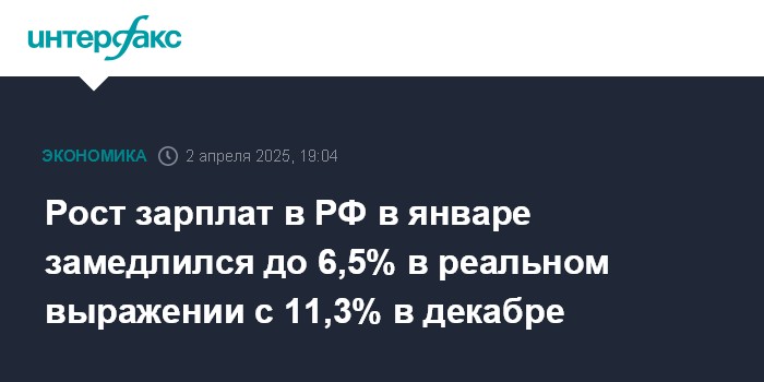 Москва. 2 апреля. INTERFAX.RU - Рост реального размера (с поправкой на инфляцию) заработной платы в РФ в январе 2025 года составил 6,5% в годовом выражении после повышения на 11,3% в декабре, на 7,3% в ноябре, на 7,2% в октябре, на 8,4% в сентябре, 7,7% в августе, на 8,1% в июле, на 6,2% в июне, на 8,8% в мае, на 8,5% в апреле, на 12,9% в марте, на 10,8% в феврале и на 8,5% в январе 2024 года, сообщил в среду Росстат.