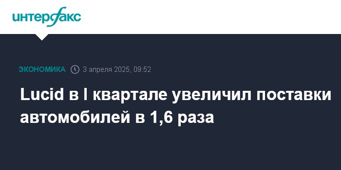 Москва. 3 апреля. INTERFAX.RU - Американский производитель электромобилей Lucid Group Inc. в первом квартале увеличил поставки в 1,6 раза - до 3 109 машин по сравнению с 1 967 за аналогичный период прошлого года, сообщается в пресс-релизе компании.