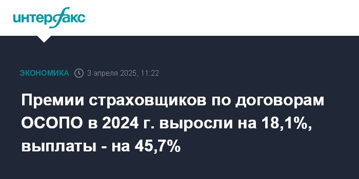 Премии страховщиков по договорам ОСОПО в 2024 г. выросли на 18,1%, выплаты - на 45,7%