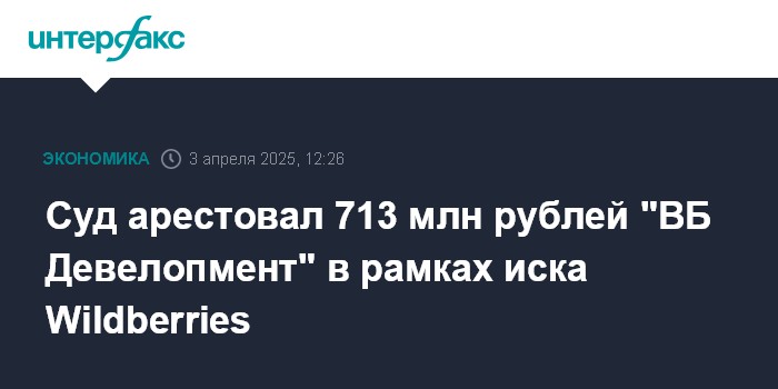 Москва. 3 апреля. INTERFAX.RU - Обеспечительные меры, введенные накануне судом в рамках иска Wildberries против ООО "ВБ Девелопмент" на 713 млн рублей, предусматривают арест денежных средств в пределах суммы иска, а также запрет для "ВБ Девелопмент" уступать права требования к подрядчикам, с которыми заключены договоры на выполнение функций технического заказчика. Об этом говорится в материалах, опубликованных в картотеке арбитражных дел.