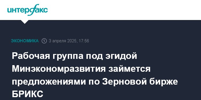 Москва. 3 апреля. INTERFAX.RU - Конкретные предложения по созданию Зерновой биржи БРИКС будет готовить межведомственная рабочая группа под эгидой Минэкономразвития РФ. Об этом сообщается в пресс-релизе по итогам совещания, которое провел вице-премьер Дмитрий Патрушев.
