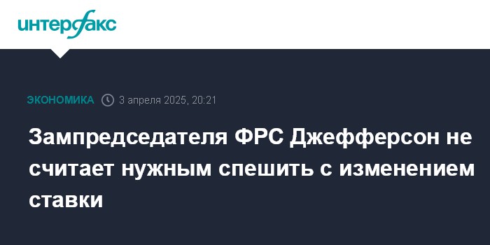 Москва. 3 апреля. INTERFAX.RU - Федеральной резервной системе США нет необходимости спешить с дальнейшей корректировкой денежно-кредитной политики, считает зампредседателя Федрезерва Филип Джефферсон. Его заявление опубликовано на сайте ФРС.
