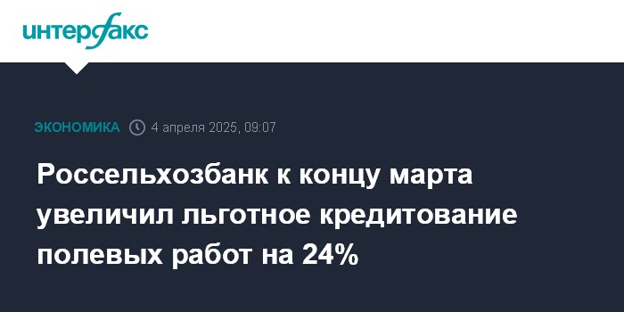 Москва. 3 апреля. INTERFAX.RU - Россельхозбанк к концу марта направил на льготное кредитование сезонных полевых работ 65 млрд рублей, что на 24% больше, чем годом ранее. Об этом сообщает кредитная организация со ссылкой на первого зампреда правления Ирину Жачкину.