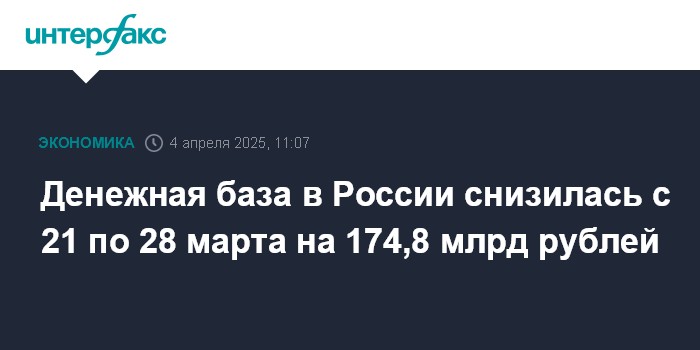 На 21 марта денежная база в России равнялась 18114,5 млрд рублей. Таким образом, за период она снизилась на 0,97%, или на 174,8 млрд рублей.
