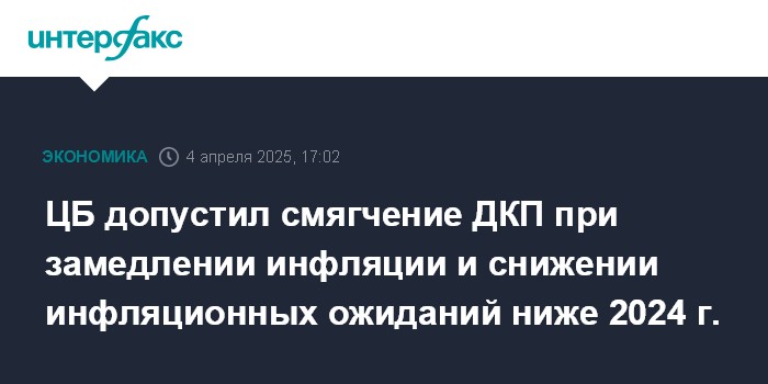 Москва. 4 апреля. INTERFAX.RU - Банк России может перейти к смягчению денежно-кредитной политики (ДКП) при замедлении инфляции и снижении инфляционных ожиданий ниже уровней 2024 года, заявил зампред ЦБ Алексей Заботкин.