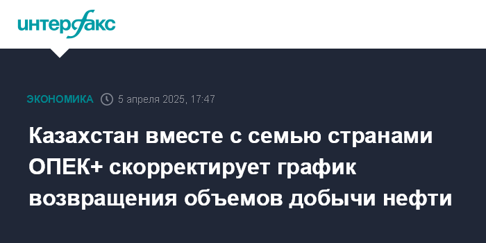 Москва. 5 апреля. INTERFAX.RU - Восемь стран ОПЕК+, реализующих дополнительные добровольные сокращения, в том числе Казахстан, провели совместную оценку рыночной ситуации, принято решение о корректировке ранее согласованного графика постепенного возвращения объемов на рынок, сообщила в субботу пресс-служба Минэнерго Казахстана.