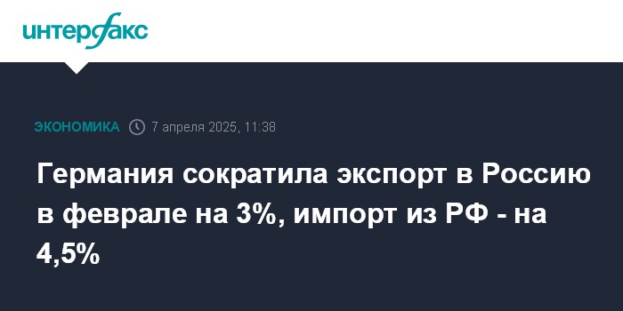 Москва. 7 апреля. INTERFAX.RU - Германия сократила экспорт в Россию в феврале на 3% по сравнению с январем - до 592,84 млн евро, говорится в отчете Федерального статистического управления ФРГ (Destatis).