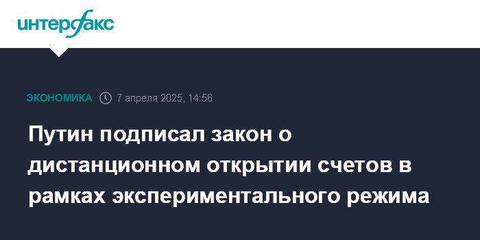Москва. 7 апреля. INTERFAX.RU - Президент Владимир Путин подписал закон, который разрешает банкам в рамках экспериментального правового режима (ЭПР) открывать счета гражданам без необходимости личного присутствия, сообщает официальный портал правовой информации.