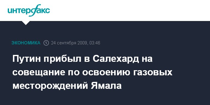 Салехард. 24 сентября. ИНТЕРФАКС - Премьер-министр РФ Владимир Путин прибыл в Салехард, где проведет совещание по вопросу об освоении месторождений газа полуострова Ямал.