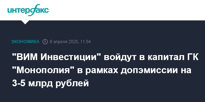 "ВИМ Инвестиции" войдут в капитал ГК "Монополия" в рамках допэмиссии на 3-5 млрд рублей