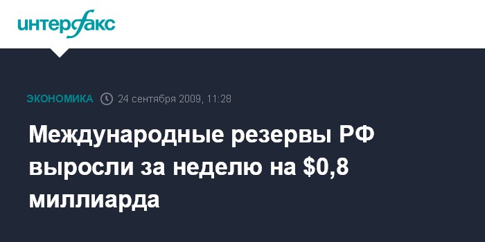 Москва. 24 сентября. INTERFAX.RU - Международные резервы России на 18 сентября составили $411,7 млрд, сообщил в четверг департамент внешних и общественных связей Банка России. Между тем по состоянию на 11 сентября международные резервы РФ равнялись $410,9 миллиарда. Таким образом, за неделю они увеличились на $0,8 миллиарда.