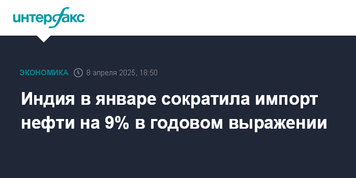 Москва. 8 апреля. INTERFAX.RU - Индия в январе импортировала 18,62 млн тонн нефти - на 9% меньше, чем в январе 2024 года, сообщается в статистических материалах министерства торговли страны. В денежном выражении поставки составили $10,07 млрд (-16,4% г/г).