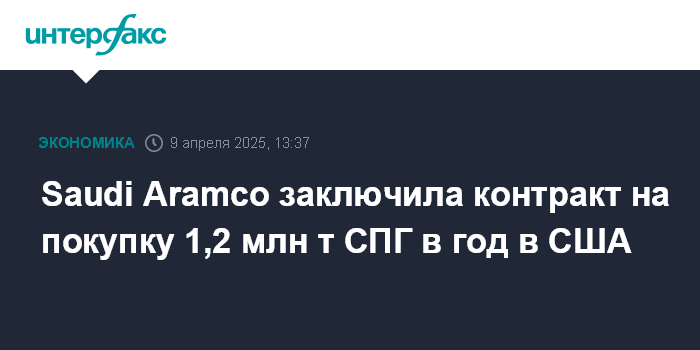 Москва. 9 апреля. INTERFAX.RU - Саудовская госкомпания Saudi Aramco заключила соглашение о покупке 1,2 млн т сжиженного природного газа (СПГ) с NextDecade Corporation, сообщила американская компания.