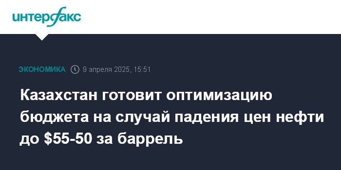 Москва. 9 апреля. INTERFAX.RU - Правительство Казахстана готовит сценарии оптимизации бюджета при снижении цены на нефть до $55 и $50 за баррель, сообщил на брифинге в мажилисе вице-премьер - министр национальной экономики Серик Жумангарин.