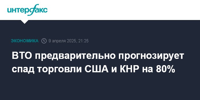 Москва. 9 апреля. INTERFAX.RU - Объем торговли товарами между Китаем и США может упасть на 80% на фоне масштабных взаимных пошлин, полагают аналитики Всемирной торговой организации.