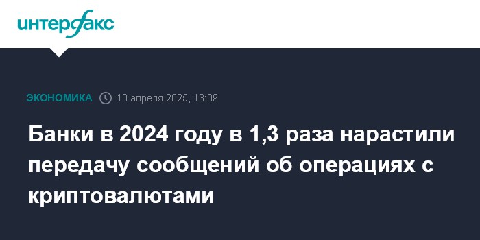 Москва. 10 апреля. INTERFAX.RU - Банки в 2024 году в 1,3 раза увеличили количество сообщений в Росфинмониторинг об операциях, связанных с криптовалютой. Об этом заявила начальник отдела мониторинга рисков подотчетных субъектов управления организации надзорной деятельности Росфинмониторинга Мария Щербакова.