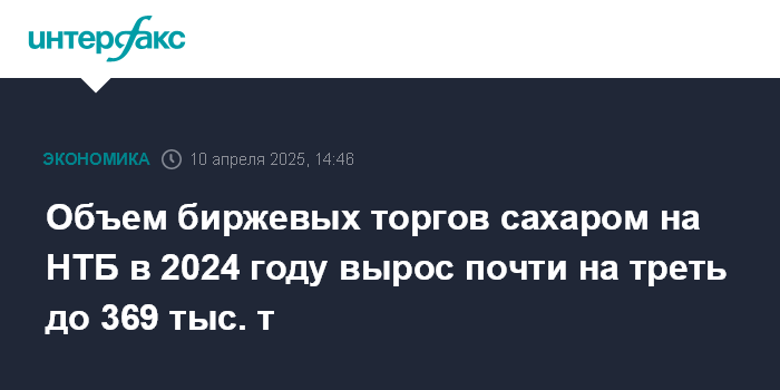 Москва. 10 апреля. INTERFAX.RU - Объем биржевых торгов сахаром на Национальной товарной биржей (НТБ) в 2024 году составил 369,156 тыс. тонн, что почти на треть больше, чем в 2023 году (279,1 тыс. тонн). Об этом сообщается в презентации биржи, представленной на международной конференции "Рынок сахара СНГ 2025" в четверг в Москве.