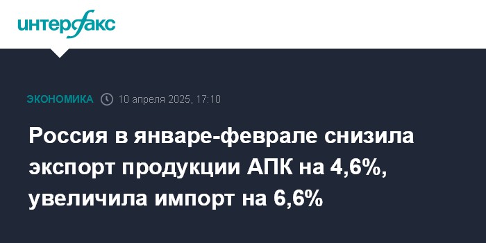 Россия в январе-феврале снизила экспорт продукции АПК на 4,6%, увеличила импорт на 6,6%