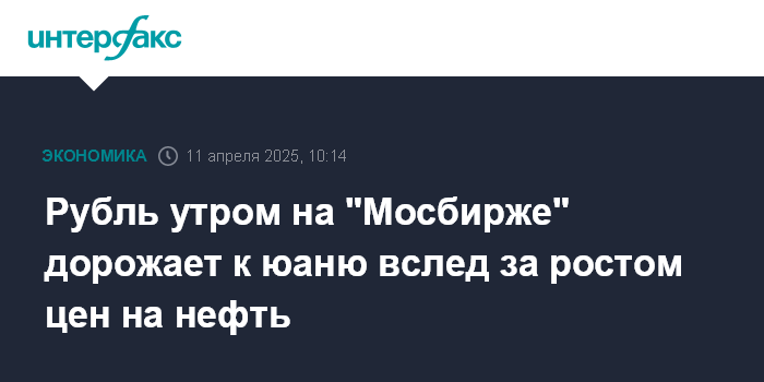 Москва. 11 апреля. INTERFAX.RU - Утром в пятницу на "Московской бирже" рубль дорожает к юаню на фоне повышения цен на нефть. Положительным фактором для рубля также выступает улучшение отношения инвесторов к рисковым активам после приостановки введения пошлин на импорт в США из ряда стран. Кроме того, участники рынка надеются на продвижение украинского урегулирования .