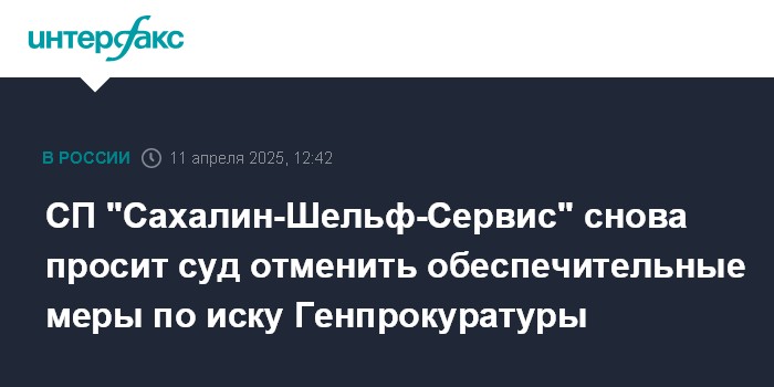 Москва. 11 апреля. INTERFAX.RU - СП ООО "Сахалин-Шельф-Сервис" (работает на углеводородных шельфовых проектах Сахалина и Камчатки) вновь подало в Арбитражный суд Сахалинской области заявление об отмене обеспечительных мер по иска Генпрокуратуры о выводе из-под управления государства доли в этом СП, суд рассмотрит его 18 апреля, говорится в картотеке арбитражных дел.