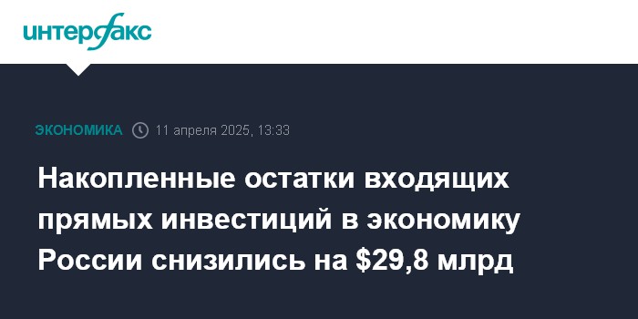 Москва. 11 апреля. INTERFAX.RU - Накопленные остатки по исходящим прямым инвестициям России в 2024 году снизились на $29,8 млрд - до $230,0 млрд, тогда как остатки по входящим прямым инвестициям сократились на $63,3 млрд, до $216,0 млрд, следует из данных на сайте Банка России.