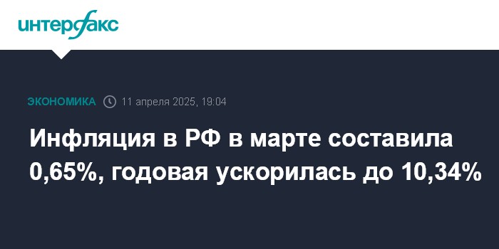 Годовая инфляция, по данным Росстата, в марте 2025 года ускорилась до 10,34% (аналитики ожидали 10,25%) с 10,06% на конец февраля, 9,92% на конец января и 9,52% на конец декабря 2024.