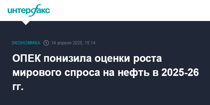 Москва. 14 апреля. INTERFAX.RU - ОПЕК впервые с января скорректировала свои оценки темпов роста спроса на нефть в 2025 и 2026 годах, понизив их на 150 тыс. б/с, - до 1,3 млн б/с и 1,28 млн б/с соответственно, говорится в ежемесячном отчете организации.