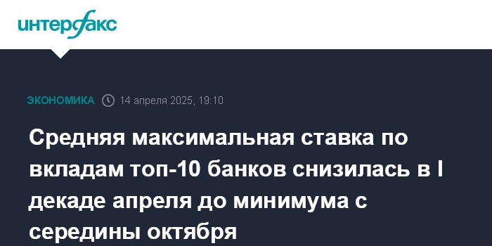 Средняя максимальная ставка по вкладам топ-10 банков снизилась в I декаде апреля до минимума с середины октября