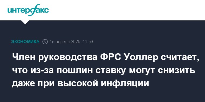 Москва. 15 апреля. INTERFAX.RU - Тарифная политика президента США Дональда Трампа - одно из сильнейших потрясений для экономики США за многие десятилетия, которое может заставить Федеральную резервную систему (ФРС) снизить процентную ставку для предотвращения рецессии, даже если инфляция будет оставаться высокой, заявил в понедельник член совета управляющих ФРС Кристофер Уоллер.