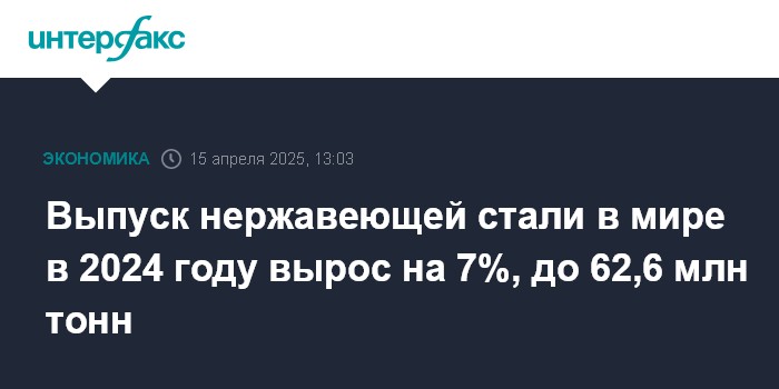 Москва. 15 апреля. INTERFAX.RU - Мировое производство нержавеющей стали в 2024 году выросло на 7%, до 62,621 млн тонн (58,539 млн тонн в 2023 году), сообщила Всемирная ассоциация нержавеющей стали (World Stainless Association, ранее - International Stainless Steel Forum, ISSF).