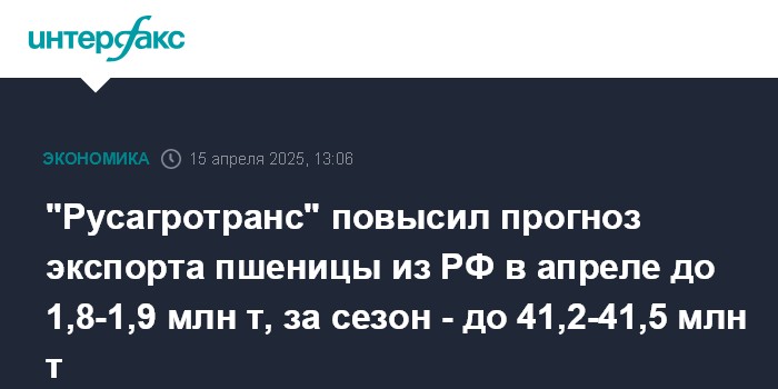 Москва. 15 апреля. INTERFAX.RU - Аналитический центр "Русагротранса" повысил прогнозы экспорта пшеницы из РФ в апреле и по итогам текущего сельхозсезона (июль 2024 - июнь 2025 гг.).