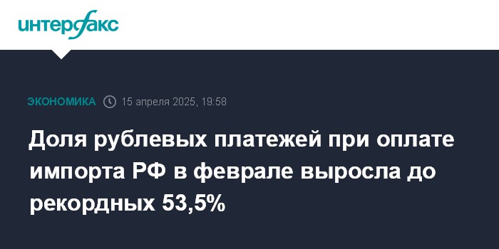 Москва. 15 апреля. INTERFAX.RU - Доля платежей в российских рублях при оплате импортных поставок в РФ товаров и оказания услуг в феврале 2025 года достигла нового максимума - 53,5%. Это следует из данных ЦБ РФ о валютной структуре внешнеторговых расчетов.