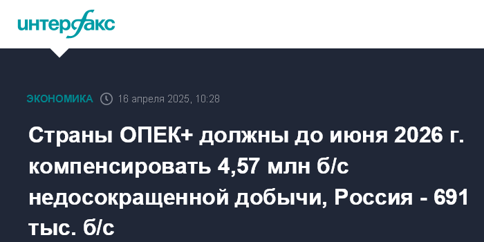 Страны ОПЕК+ должны до июня 2026 г. компенсировать 4,57 млн б/с недосокращенной добычи, Россия - 691 тыс. б/с
