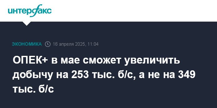 ОПЕК+ в мае сможет увеличить добычу на 253 тыс. б/с, а не на 349 тыс. б/с