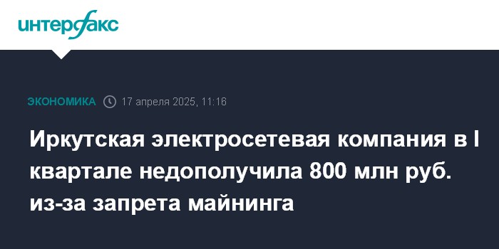 Москва. 17 апреля. INTERFAX.RU - "Иркутская электросетевая компания" (ИЭСК) в январе-марте 2025 года недополучила около 800 млн рублей выручки после запрета майнинга криптовалют на юге Иркутской области. Об этом сообщил заместитель гендиректора по развитию и технологическим присоединениям ИЭСК Сергей Ересов.