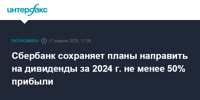 Греф в феврале заявил, что Сбербанк планирует выплатить дивиденды за 2024 год в полном объеме (не менее 50% от чистой прибыли).