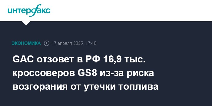 Москва. 17 апреля. INTERFAX.RU - Российское представительство китайского автоконцерна GAC - ООО "Гак Мотор Рус" - отзывает в РФ 16 944 кроссовера GAC GS8 из-за потенциального риска возгорания вследствие утечки топлива в соединении насоса высокого давления и топливной трубки. Об этом сообщило Федеральное агентство по техническому регулированию и метрологии (Росстандарт).