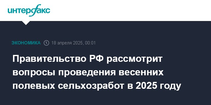 Москва. 18 апреля. INTERFAX.RU - Правительство РФ на заседании в пятницу рассмотрит вопросы, связанные с проведением весенних полевых сельскохозяйственных работ в 2025 году, сообщается в пресс-релизе кабмина.